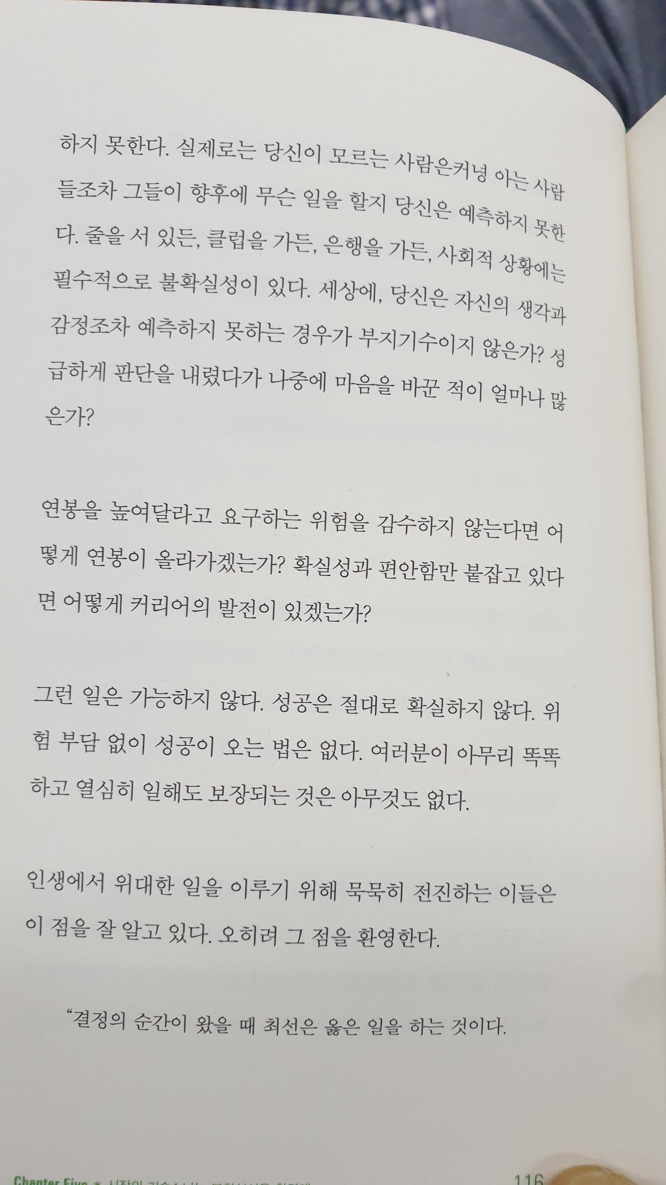 그러나, 앞의 두가지 부단하다와 지금 행동하라는 가장 와 닿는 내용이다.행동 하지 않으면 아무것도 없다..생각만으로는 아무 것도 할 수 없다..부단히 움직여라..부단히 움직이고, 부단히 부딪치고, 부단히 겪어야만 얻을 수 있다..